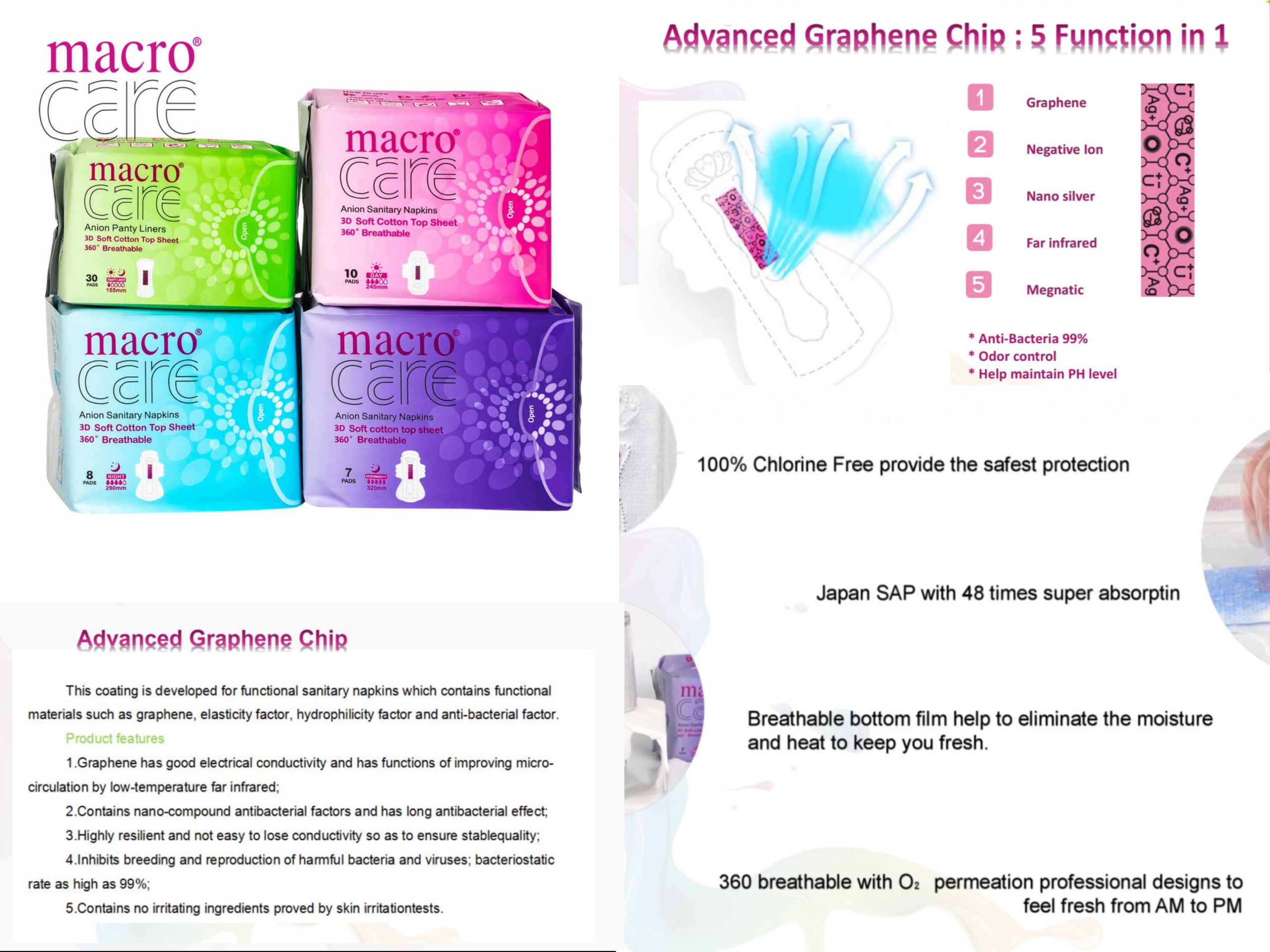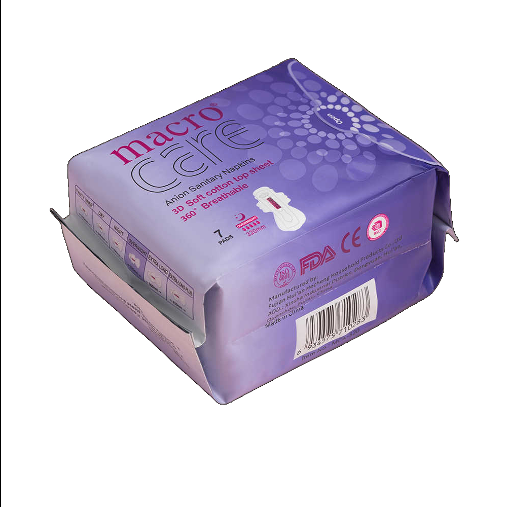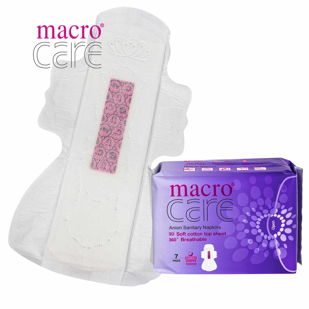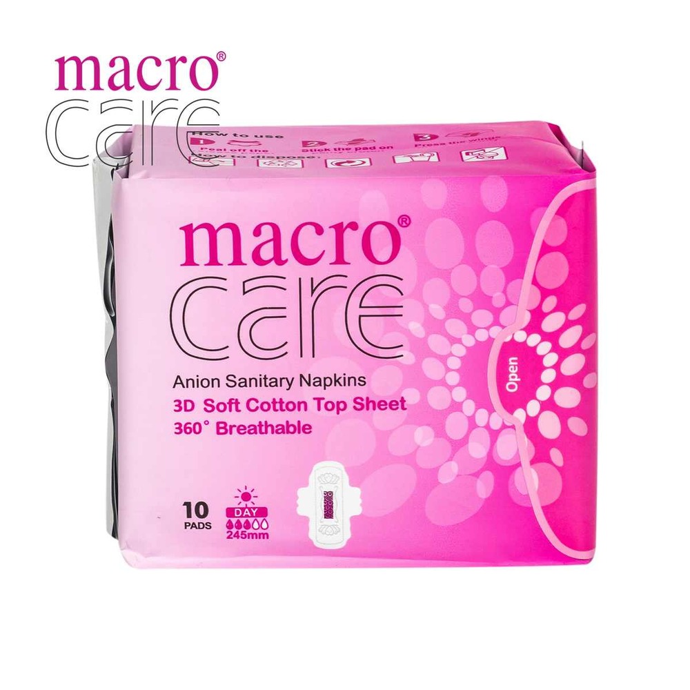 বিশ্বের ৪৭টি দেশে প্রশিদ্ধ এবং বাংলাদেশের প্রথম ৯ লেয়ার সুরক্ষা বিশিষ্ট স্যানিটারি প্যাড। সরাসরি চায়না থেকে আমদানিকৃত ম্যাক্রোকেয়ার ব্রান্ডের ৩২০/২৯০/২৪৫/১৫৫ মিমি প্যাডটি ১০০% পিউর কটন দ্বারা তৈরি যা ৩৬০° লিকেজ প্রতিরোধী।